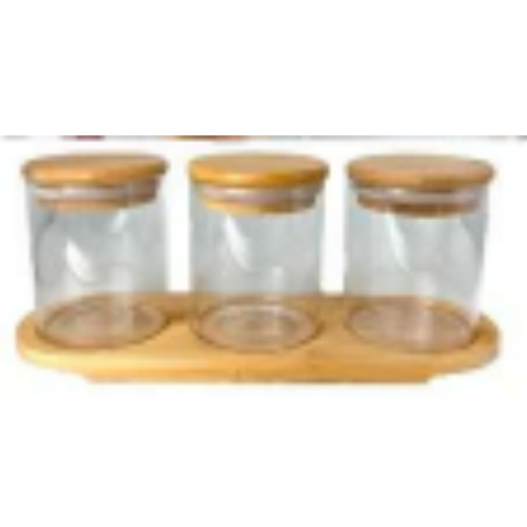 JOGO 3 POTE VIDRO 210ML + BANDEJA BAMBU