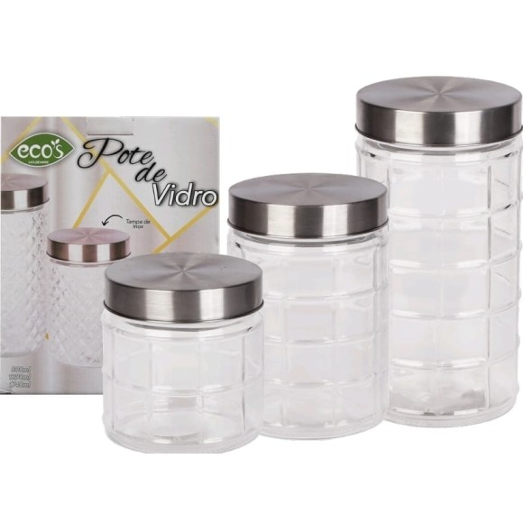 JOGO 3 POTE VIDRO TAMPA INOX
